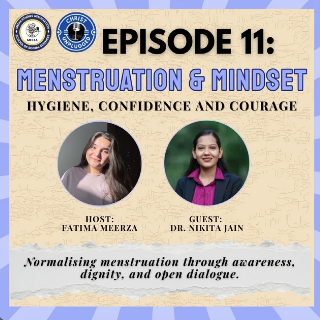 Episode 11: Menstruation & Mindset – Hygiene, Confidence & CourageDr. Nikita Jain joins this episode for an honest and insightful conversation on menstruation—moving beyond biology to explore mindset, stigma, and social psychology. In conversation with host Fatima Meerza, she reflects on first-period experiences, the embarrassment and secrecy that still surround menstruation (even in educated spaces), and how preparedness impacts confidence and mental well-being.From hiding sanitary pads at family gatherings to managing periods while travelling, the episode explores how everyday behaviours reveal deeper social conditioning.The discussion also highlights why sanitary products must be treated as essentials, the role of fathers and partners in normalising conversations, and how universities can create more period-friendly environments.A thoughtful dialogue on hygiene, dignity, confidence, and courage because normalising menstruation begins with open conversation.
